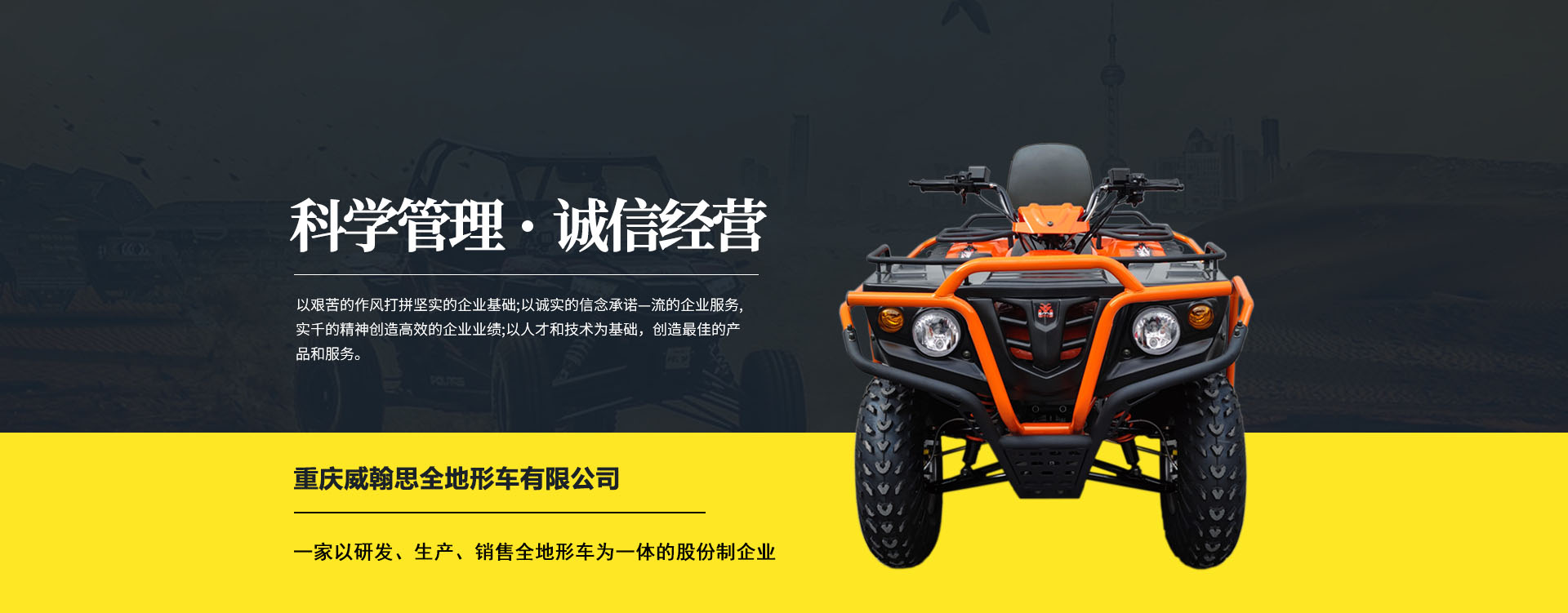 重慶威翰思全地形車有限公司成立于2016年9月,一家以研發、生產、銷售全地形車為一體的股份制企業。公司銷售額超過5000萬?,F有專業市場售后服務團隊。公司秉承“敬業、超越、活力、用戶至上”的企業精神,“以人為本,合作共贏;”的核心價值觀,“嚴格管理創優質、名牌戰略拓市場”的質量方針,使公司一步步邁上新的臺階。公司與重慶航天巴山摩托車制造公司達成戰略合作協議。共同出資致力于沙灘車旅游市場產品研發,項自運營指導,市場維護等全方位市場拓展。重慶航天巴山摩托車制造公司授權;重慶威翰思全地形車有限公司為中國區唯─戰略合作伙伴。